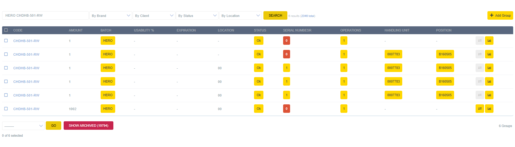 Po kliknutí na tlačítko search nám stránka vyfiltrovala podle batch a codu HERO CHDHB-501-RW a nalezlo nám to šest itemů.