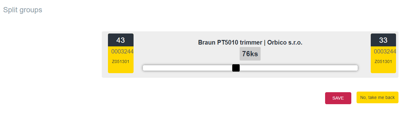 Černým čtvercem upravujeme počet. Uprostřed vidíme celkový počet itemů, na levé a pravé straně vidíme počet, na který se bude groupa rozdělovat.