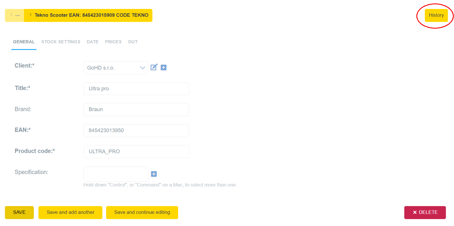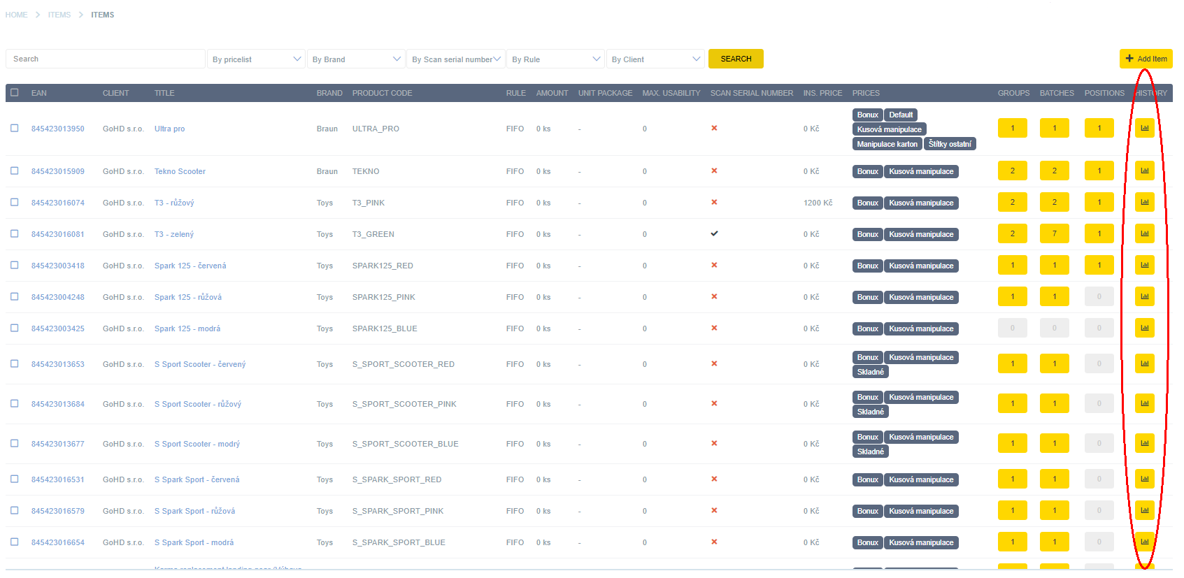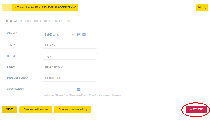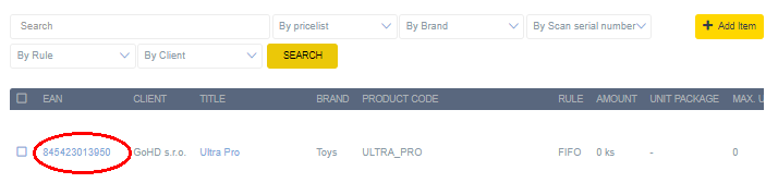 Druhou možností jak provést akci smazat, je rozkliknout podrobnější informace o předmětu na řádce. Například kliknutím na EAN kód (zvýrazněné červeným kolečkem).