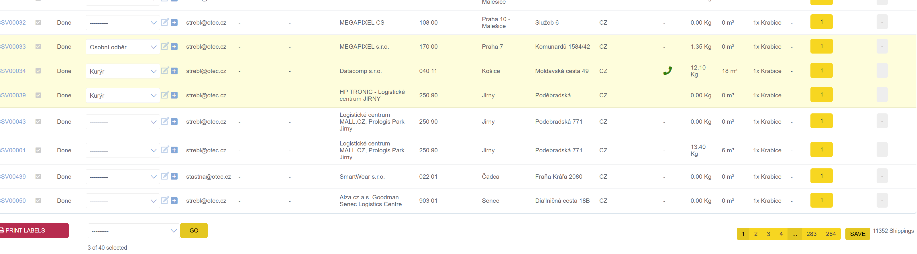 Některé políčka v seznamu lze měnit hromadně, zde je ukázka hromadné změny dopravce. Stačí vybrat dopravce kterého chcete, označit záznam aby byl žlutý a poté kliknout na „save“ vedle počtu stránek (vpravo dole)“