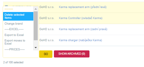 A následně na levé straně dole, vybereme možnost „Deleted selected Items“ (modře zvýrazněné) a klikneme na žluté tlačítko „GO“.