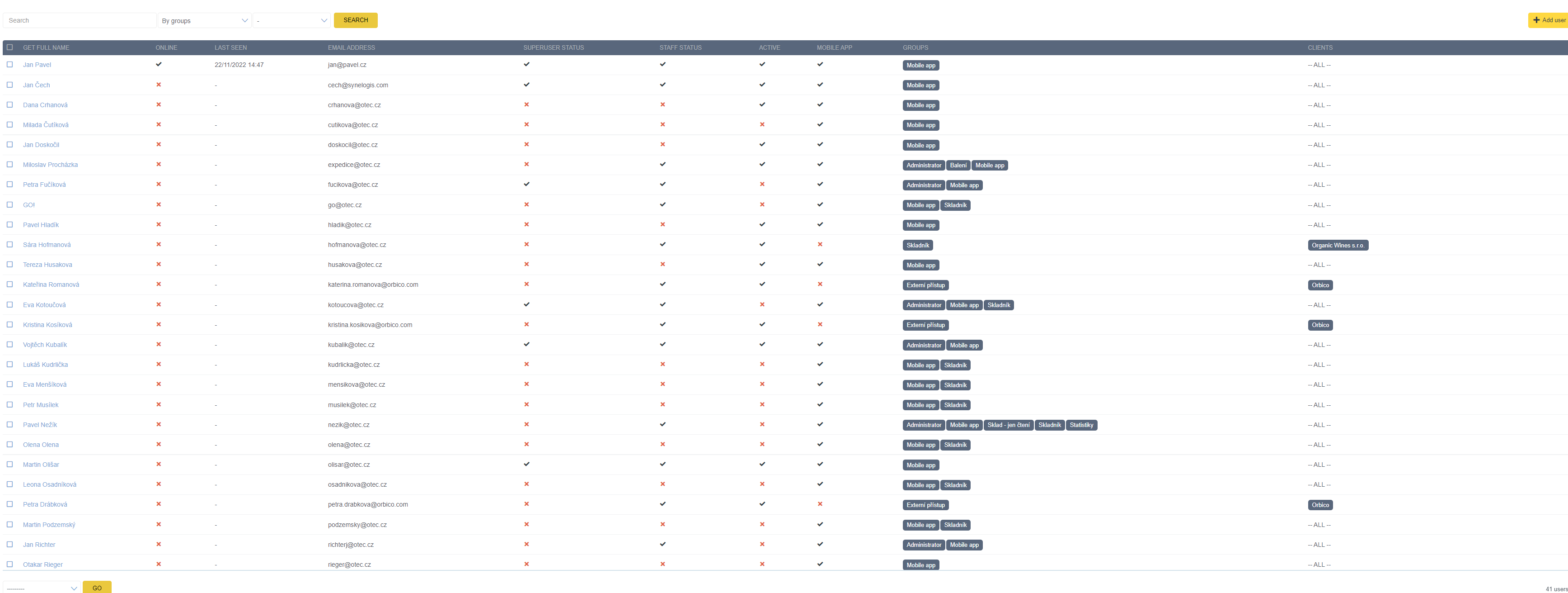Přehled uživatelů lze najit v hlavním menu pod položkou USERS. Zde se spravují přístupy do systému